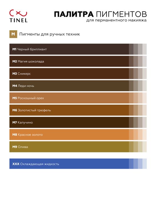 Применяется, как в мануальной технике, так и в аппаратной. Улучшенная, гипоалергенная формула неорганических пигментов. Однородный состав исключает высыхание в процессе использования. Предсказуемые цвета, не требующие корректоров. Пигменты для смешанных техник серии «М» торговой марки «Tinel» не содержат токсичные и канцерогенные компонентны, показатель PH находится в пределах нормы, ихготавливаются пигменты при строгом соблюдении всех необходимых норм и под контролем технологов. Пигменты разрешены к применению.